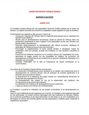 RAPPORT ANNUEL 2010Afin d'atteindre ses objectifs, la FEA a consolide ses acquis durant l'année 2010, aussi bien au niveau des projets en cours que par le développement de nouvelles synergies, notamment à travers les partenariats internationaux mis en place.D'autre part, cette année a été plus particulièrement marquée par l'organisation du Colloque international sur la médecine par les plantes, dont l'organisation a pris plusieurs mois et dont le produit final promet d'être un des volets importants de la Fondation pour ces prochaines années. La Fondation Espace Afrique remercie tous les partenaires et les personnes qui l'ont aidée à réaliser ses objectifs tout au long de cette année 2010. La Fondation exprime particulièrement sa gratitude aux autorités suisses pour leurs mesures incitatives à l'investissement humanitaire et de développement en Afrique < Retour |
